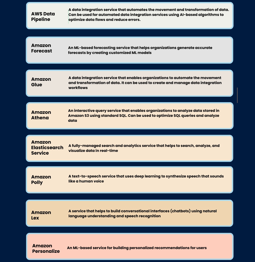 AWS has AI frameworks and tools that can be used to quick build, train and deploy your AI solutions. Based on years of research and best policies, AWS AI solutions will help developers and data scientists create customised AI and ML models to address your organization’s unique needs.