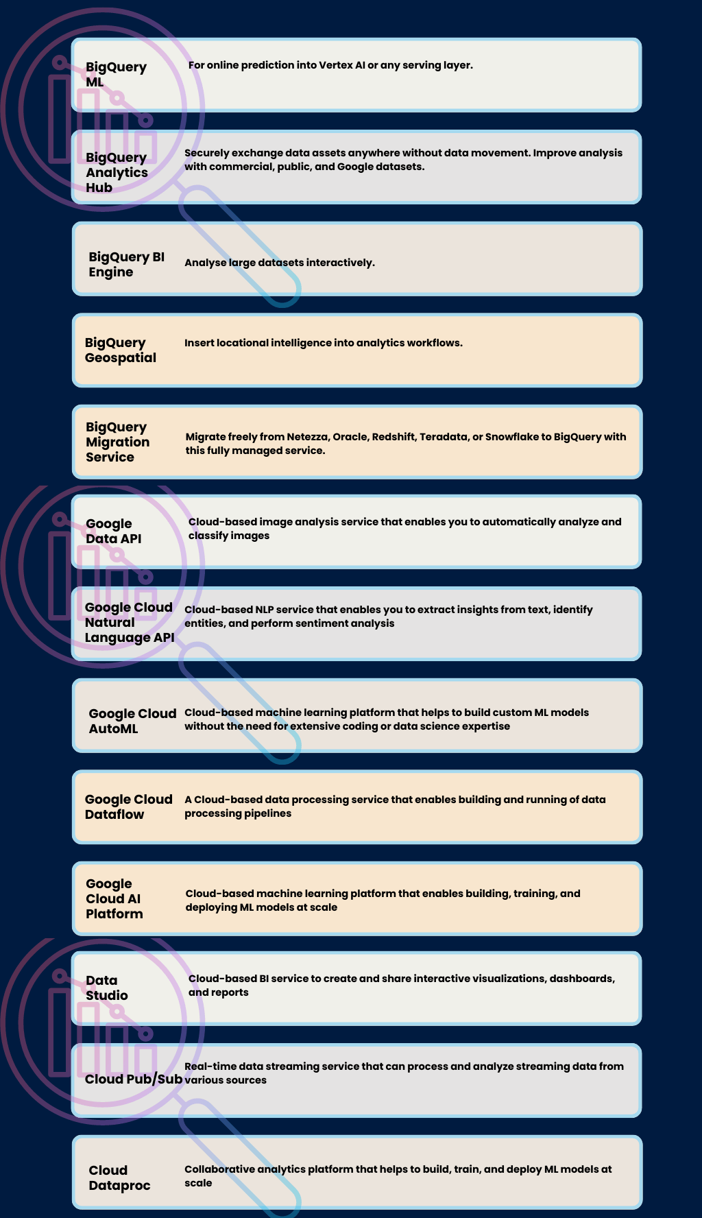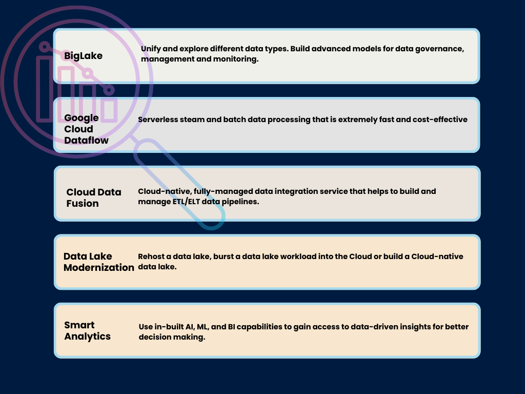 CloudLeaf uses GoogleCloud’s Smart Analytics platform to infuse intelligence into your data analytics and management. GoogleCloud Smart Analytics platform is an open-source, flexible and secure platform inbuilt with AI, ML and NLP capabilities. Our solutions help to design, deploy, train and manage AI- and ML-driven analytics to derive insightful information from your data. From data warehouse modernization to data lake modernization, stream analytics, BI, data science, and pre-built datasets, we use every GoogleCloud analytics solution available to design and enhance your data ecosystem.